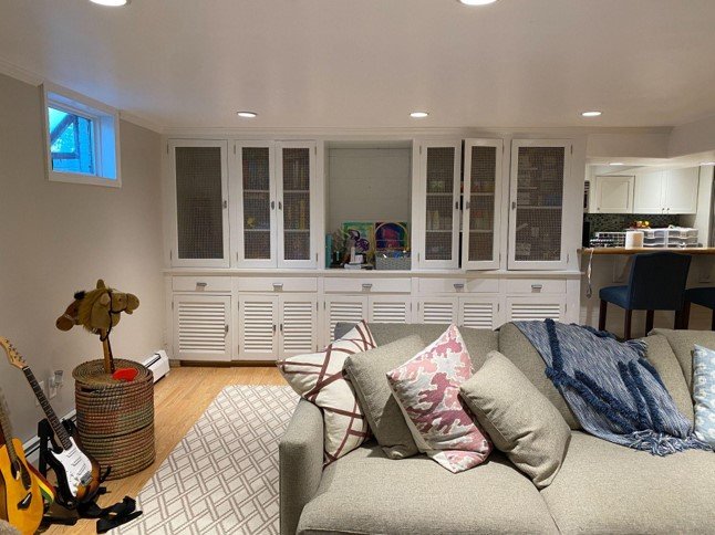 This project was brought to us by Branch Builders, who we work closely with to provide cabinets on their design projects. In this situation, Branch enlisted Carter to help draw up a plan for two areas of built-ins in a basement renovation they were contracted on. The built-ins were part of a larger project that was brought on by a leak, and the scope of work included waterproofing, new windows, new flooring, surface repairs to a kitchenette, and new built-in cabinetry. In the new cabinetry the homeowner was looking for storage that had solid door panels, rather than the chicken wire in the existing, to better hide the kids arts and crafts supplies. They also wanted a door style that was easier to clean than the louvered panels. Because they were moving another run of cabinetry, the homeowners and Branch Builders decided that a custom permanent solution would better serve as a TV surround.