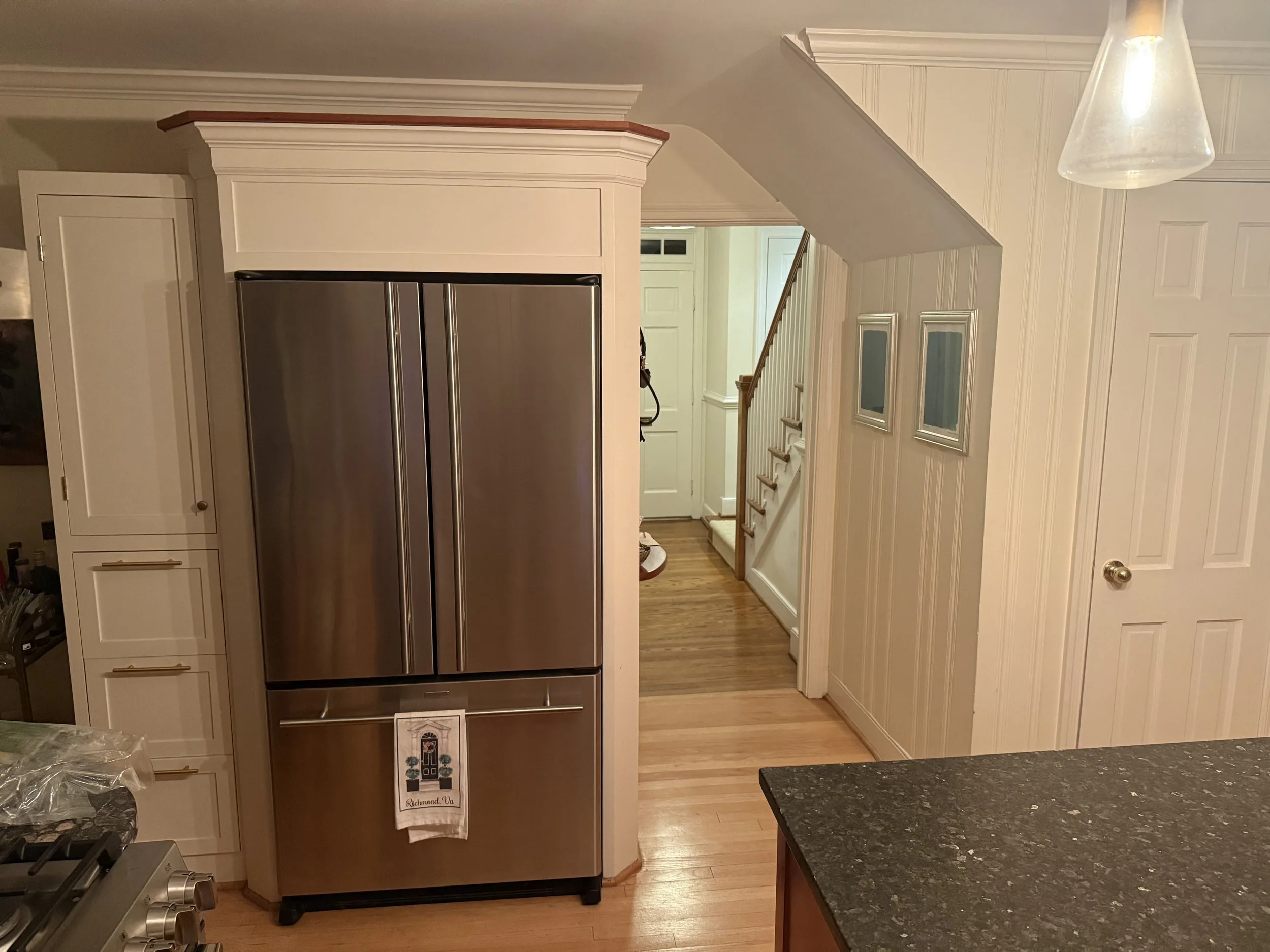 The stainless steel fridge was swapped with a panel-ready model, and the run of cabinets was extended beyond it. With the addition of the wall and pantry cabinets, storage in this space has easily doubled.
