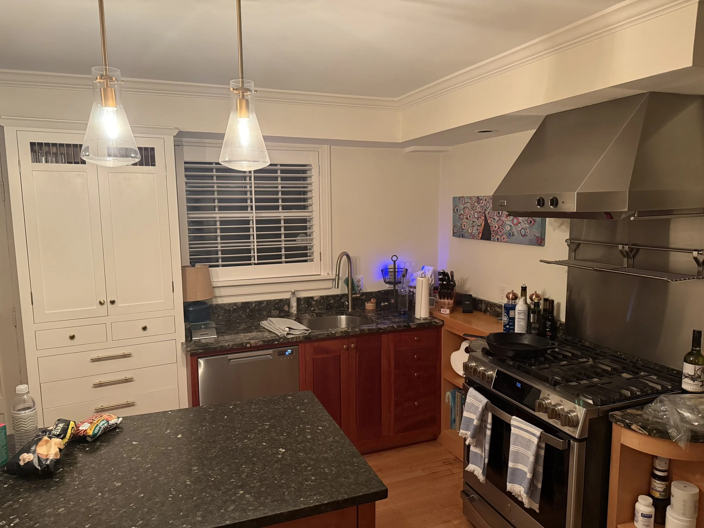 After purchasing their home in the post-Covid real estate boom, these young homeowners spent time living in their home and thinking about what would work best for them before jumping into a renovation. The soffits and mismatched cabinetry created a space that felt disjointed. The lack of wall cabinets and the open shelving surrounding the range added a feeling of disorganization. The homeowners worked with Curtis to envision a space that felt cozy but stately in design, with plenty of storage and touches of beauty throughout.