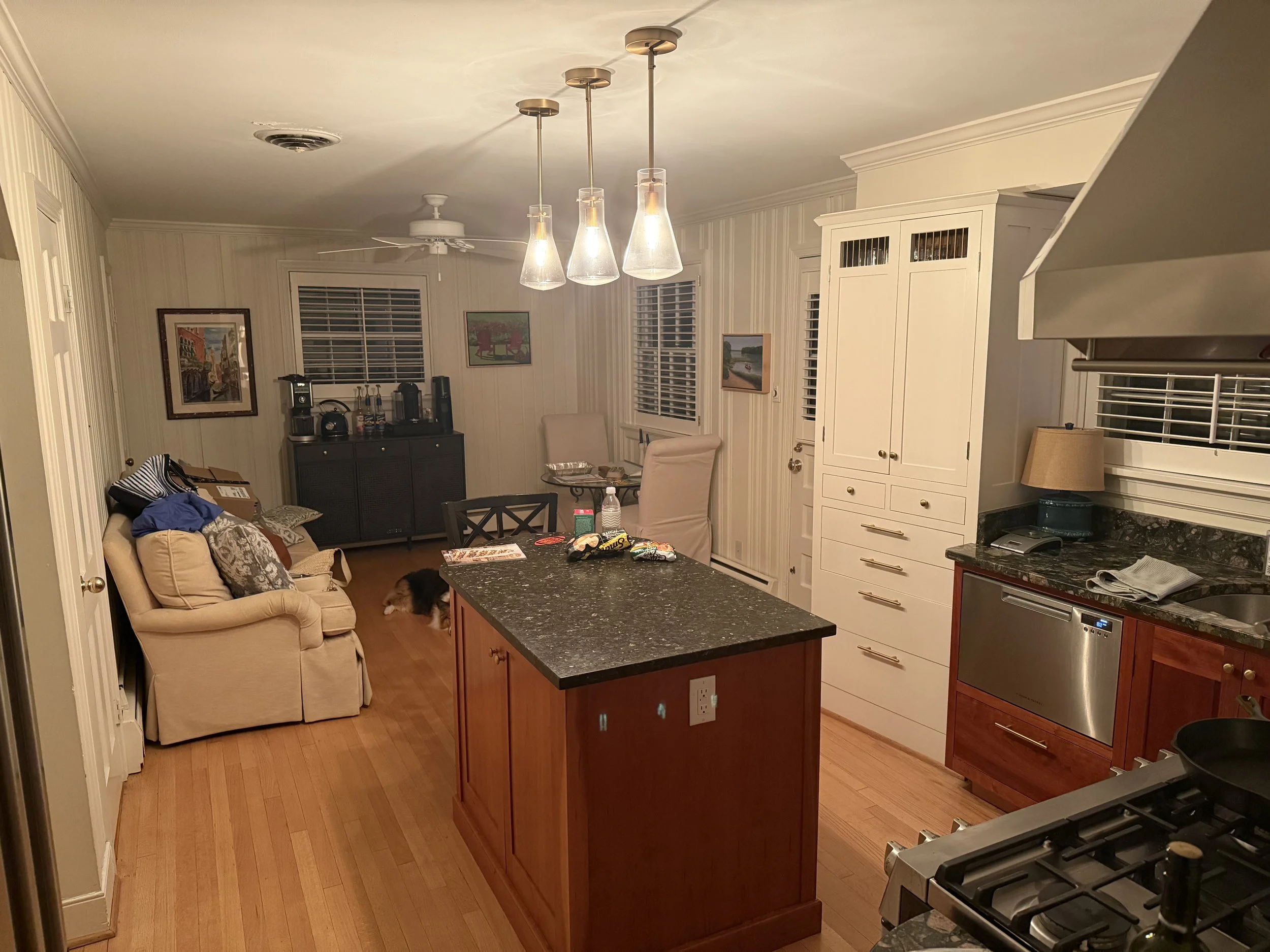 The new banquette built completely in the Custom Kitchens workshop by our talented carpenter, Robert, is complete with storage drawers on both sides, outlets, and channels for the floor registers. The table is actually two separate pieces, the pedestal came from a table that the couple previously owned. A new walnut top was crafted to match by Grothouse, a wood top fabricator. It’s a hit with family pup, Gus!