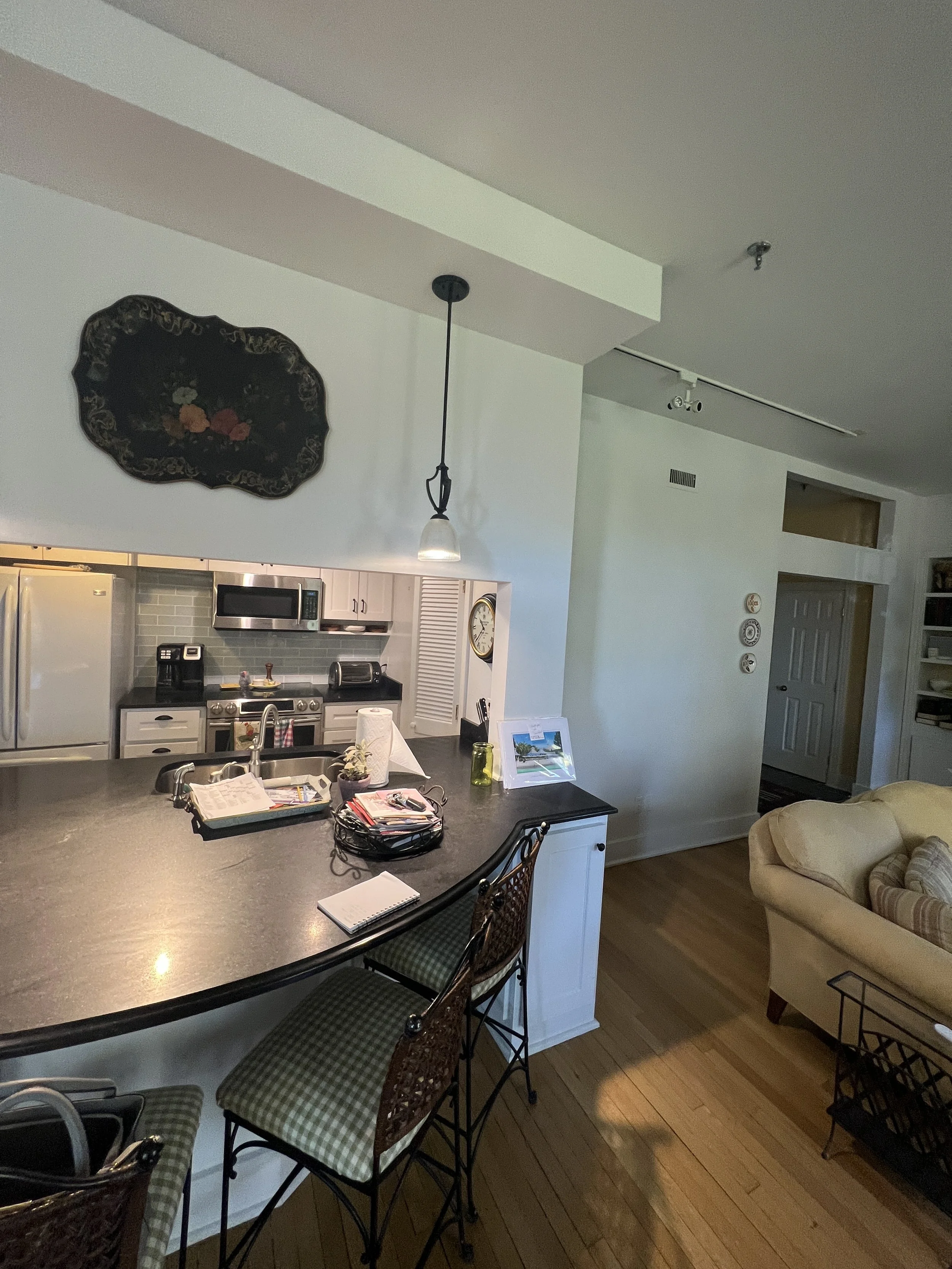 This condo is located in the heart of the fan in The Warsaw. Serving as the homeowner’s secondary residence, this space functions as home when business pulls them to the city from their river home. The space was truncated by heavy soffits and non-bearing walls, and an 80’s mirror made the space confusing upon first entering.