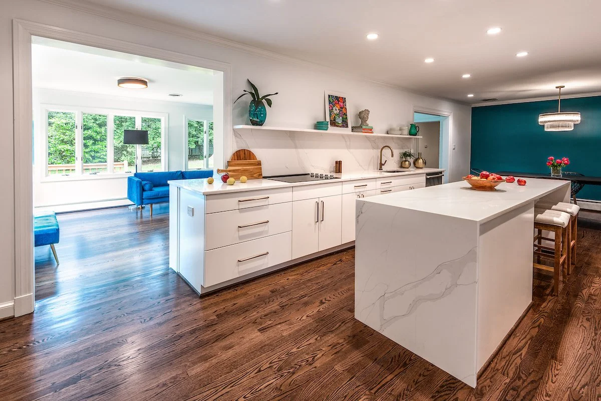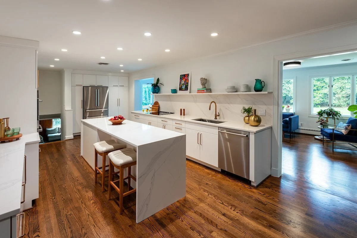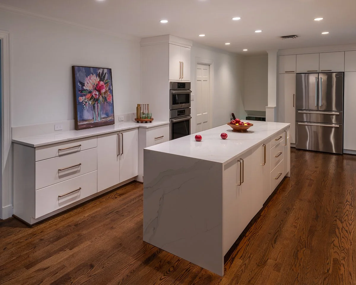 This kitchen is all about subtle materials that create a big impact. The veining of the quartz, slab doors, sleek hardware, and waterfall edges result in an amazing transformation.