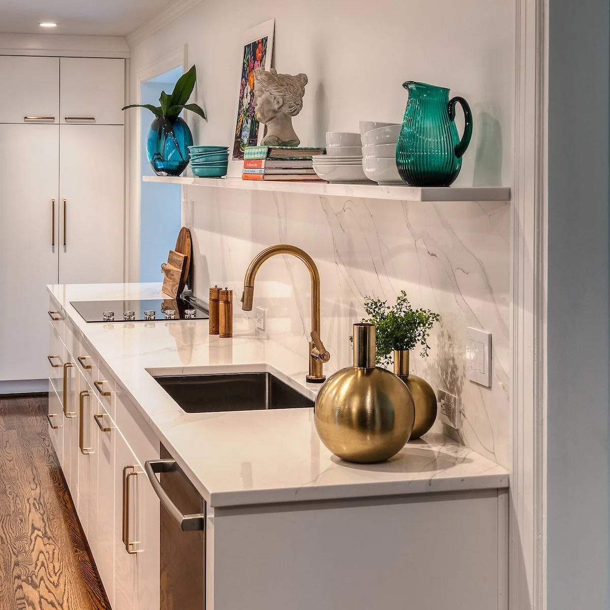 The star of the show is the 153” long floating shelf. The pattern of the quartz starts with the countertop continuing with the backsplash and ending with the shelf. While challenging to install, the shelf adds a sophisticated look to the overall design.
