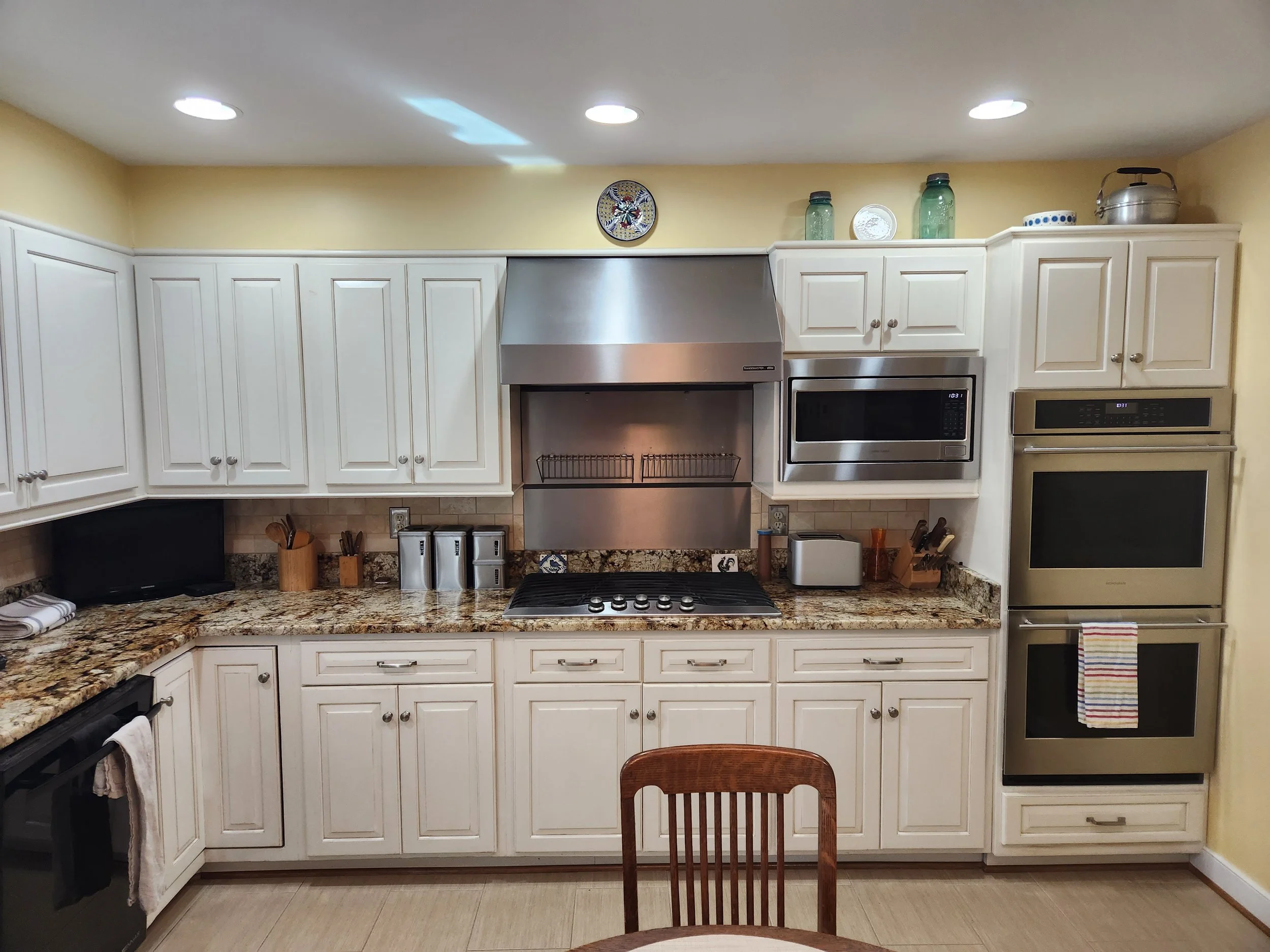 The rangetop hood was beloved by the homeowners, and they knew they wanted to find a way to keep it for the new kitchen. Their designer, Allison, worked hard with our installers to find a way to replace all of the inner workings of the hood to make it more functional. A new stainless steel backsplash was added, as the homeowners loved how easy it is to clean up behind the rangetop.