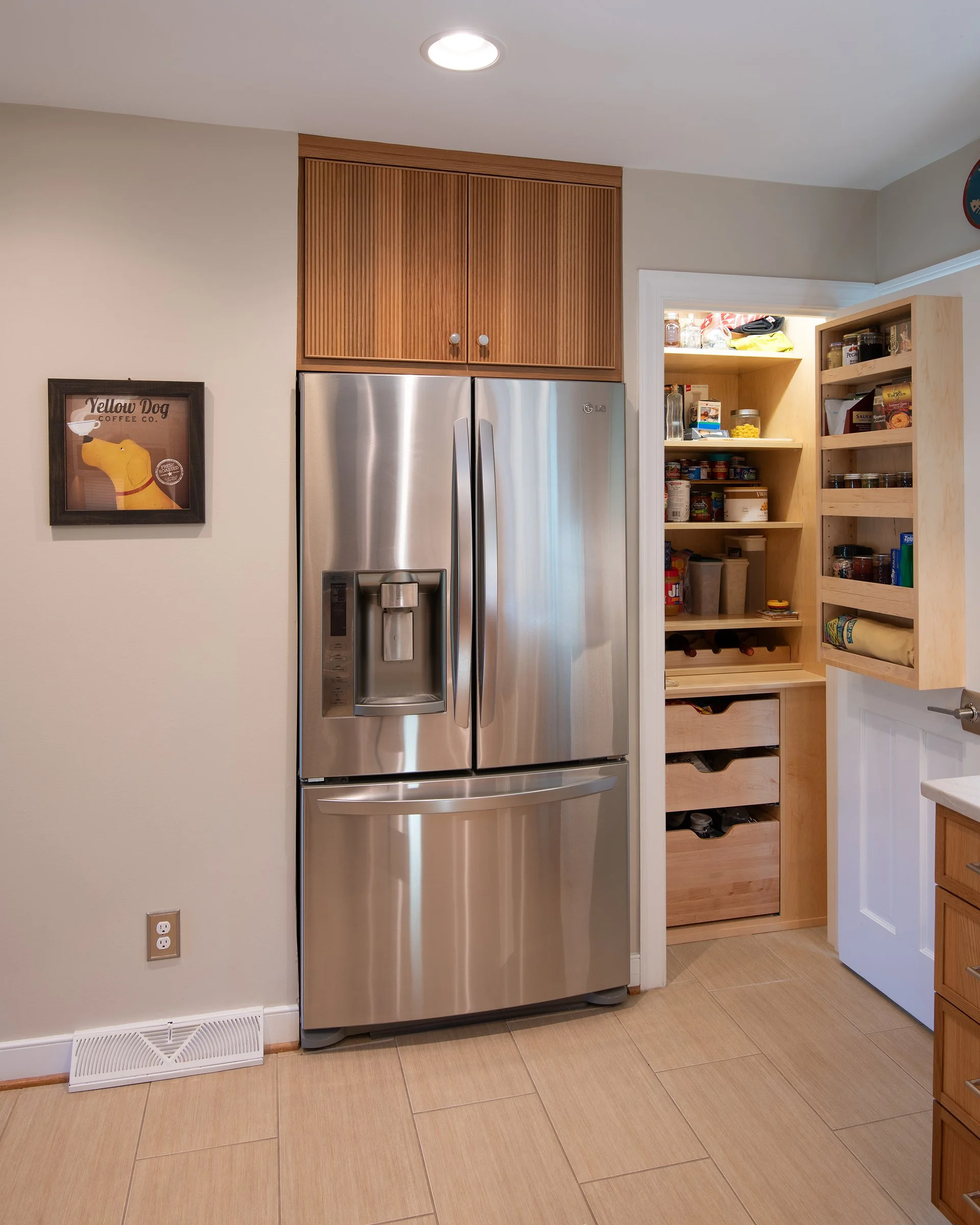 Just behind the kitchen table sits the refrigerator and pantry. Carter, another of our designers, worked on this project with Allison and turned the pantry into his pet project. He made sure every nook and cranny of the pantry was maximized and planned to the sixteenth of an inch, which was a huge improvement over the former builder grade wire shelves.