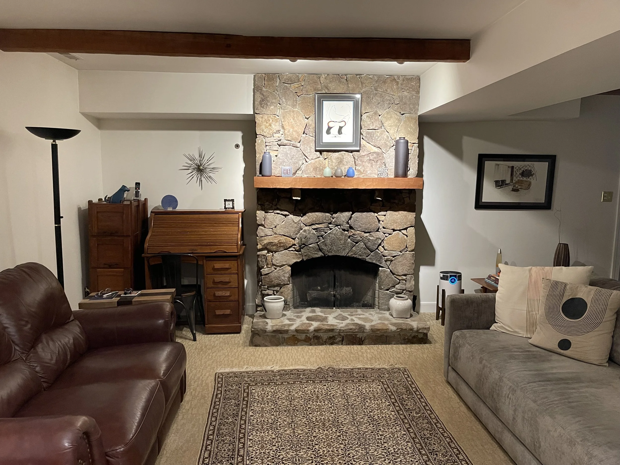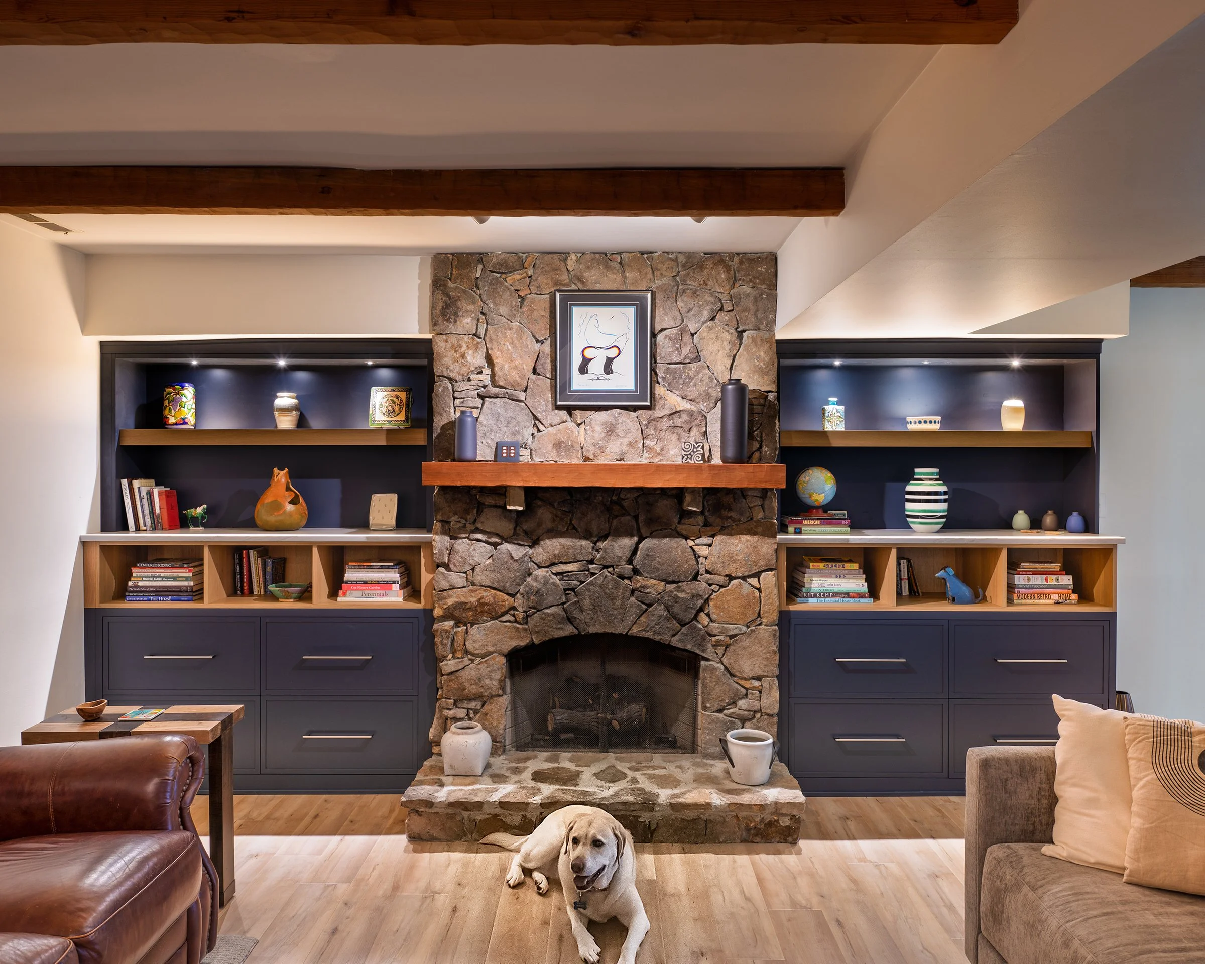 After completing the kitchen renovation, the homeowners enjoyed working with Allison & Carter so much that they decided to take on their next renovation sooner than they planned! Spending most of their leisure time in the basement, they wanted a space that was more functional and beautiful. Allison designed an open and closed storage solution that sat seamlessly against the stone fireplace. Deep drawers held storage for records, board games, dog toys and blankets.