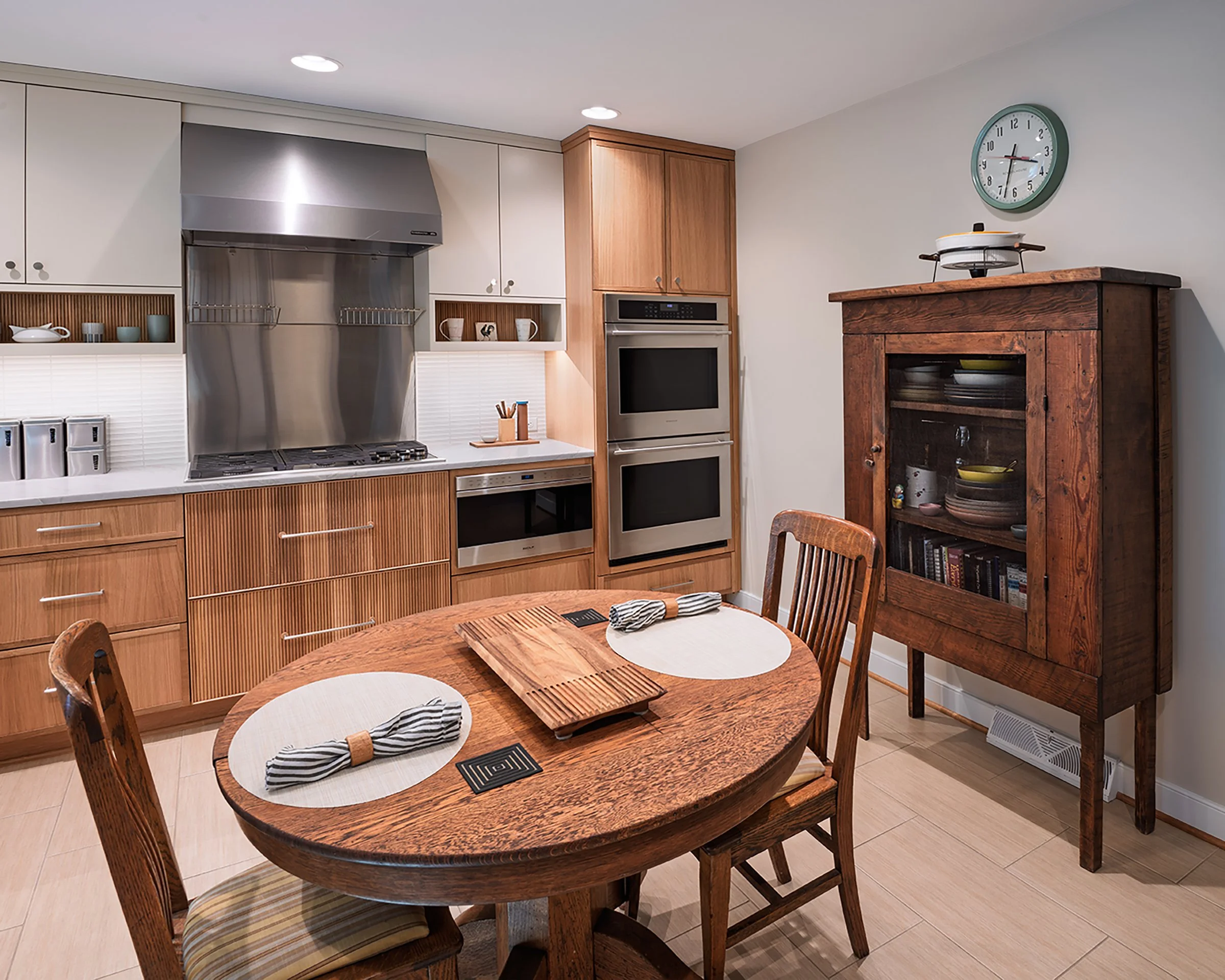 The homeowner’s existing antique collection played a crucial role in the design of the kitchen. With this Early American hutch and kitchen table, the homeowners were looking for a wood tone that meshed well with them. The barely-there stain on the oak cabinets achieved this look perfectly.